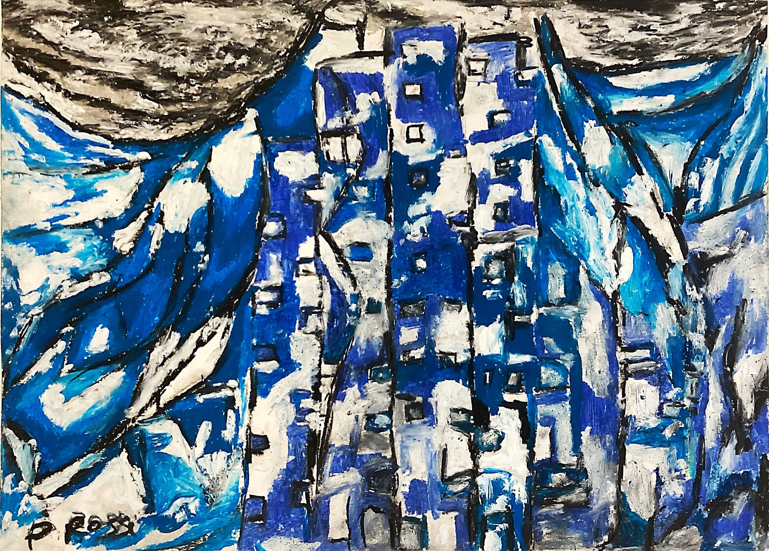Patrizia’s approach is organic and intuitive, beginning with a draught of delicate penicil marks that are later subsumed over by a thick, visceral oil pastels, developing figurative, geographic and architectural details, until they seem to be neither one thing or another but exist on their own terms. Eyes are a recurring motif: peering out from buildings, rock formations, water; whether sinister or benevolent is left to the viewer to decide.